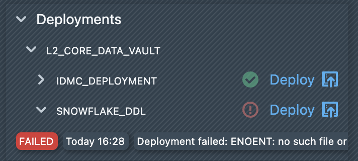 If you have disabled automatic deployments, you could manually start a deployment. To do this, you must first open a build. Under ‘Deployments,’ you will see a list of all available deployments. Clicking on ‘Deploy’ starts the deployment and the generated objects are deployed to the target system using the deployment configuration. The result of the deployment is displayed directly below the deployment in the list. A deployment can be completed with either the status FINISHED or FAILED. If the deployment fails, an error message will be displayed next to the deployment entry.
