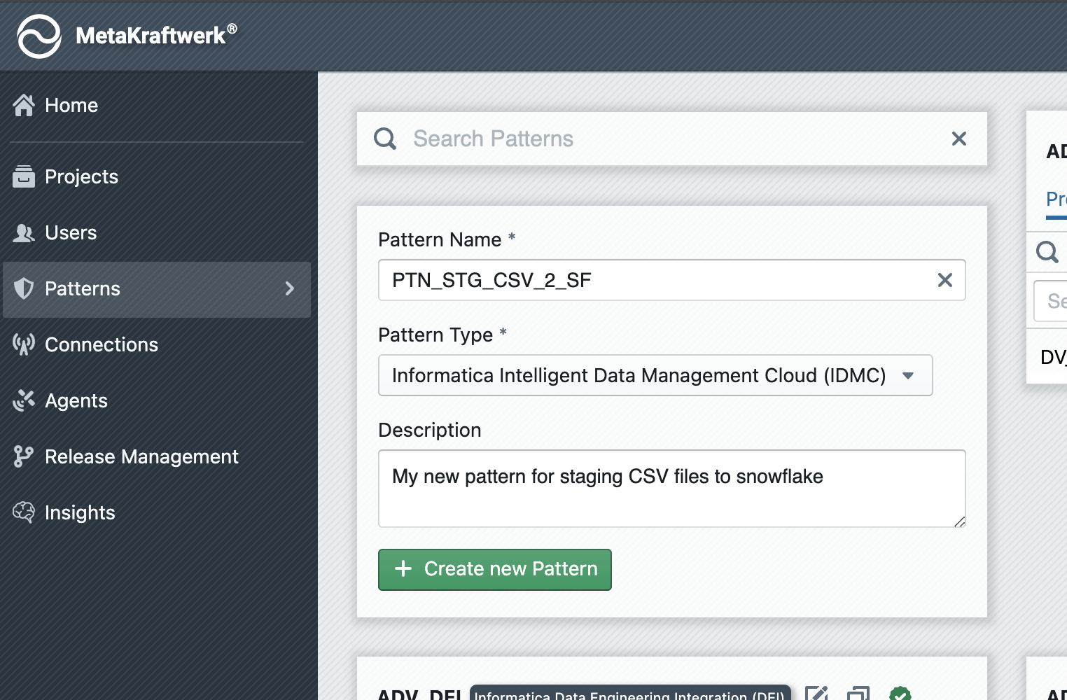 Enter the name of the new pattern, select the type (see the Integrations section) of the new pattern, and then click + Create new Pattern.