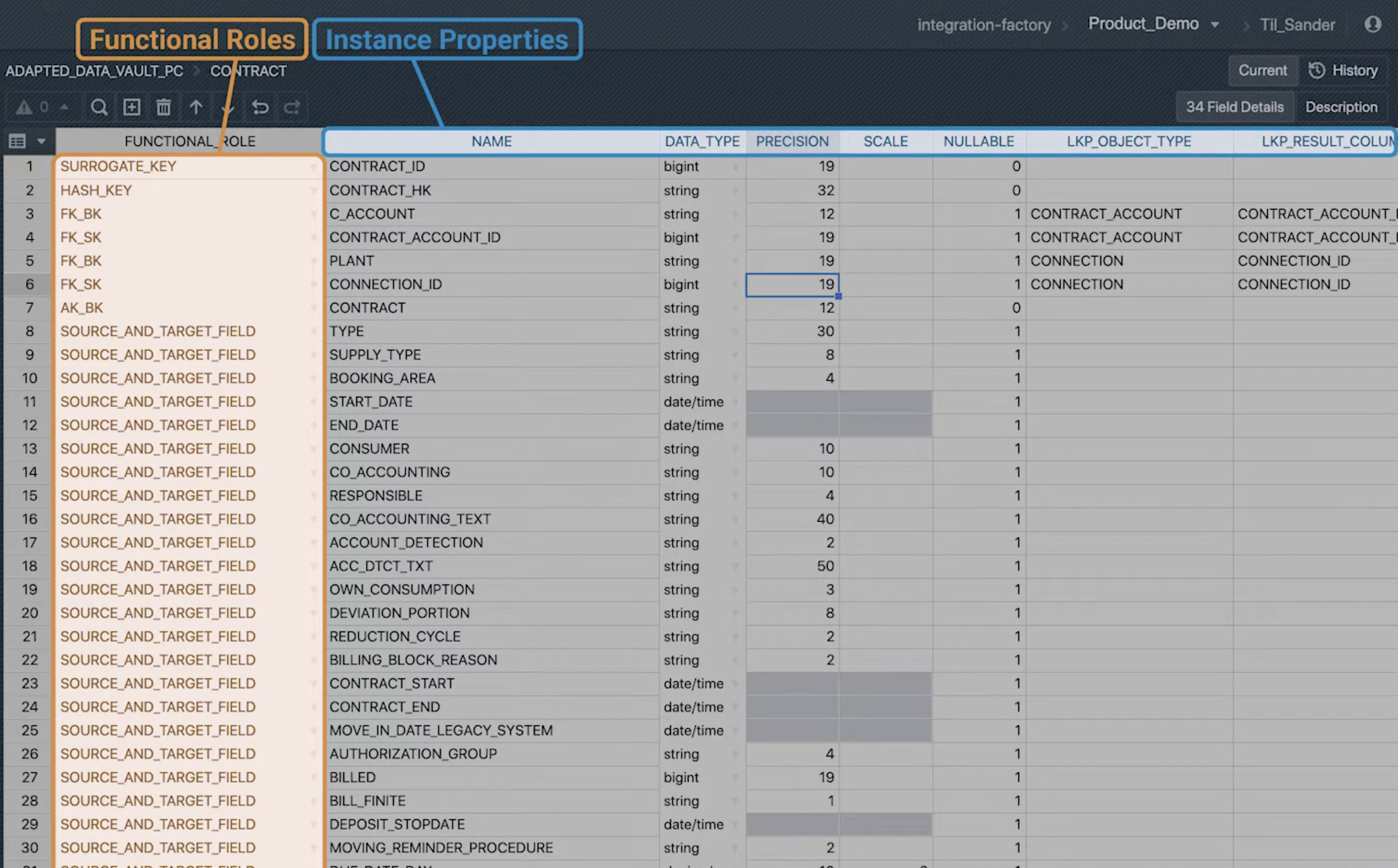 The instance properties are the columns. One instance property that always exists is "FUNCTIONAL_ROLE", which stores the functional role of the instance row.