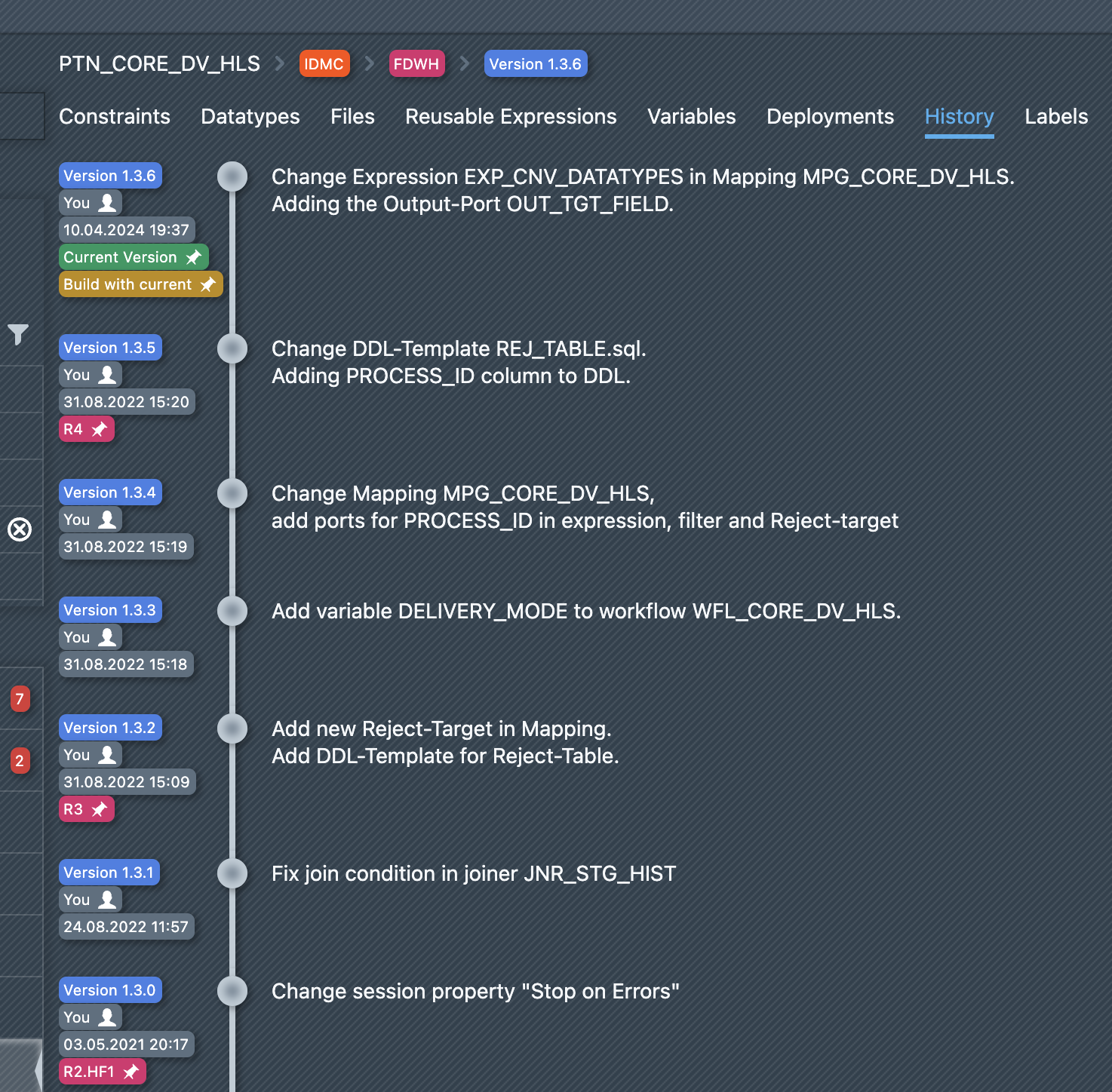 The pattern developer can thus align pattern development with the releases of the instances. For example, as shown in the screenshot above, the pattern version 1.3.2 was used for release R3, while the newer pattern version 1.3.5 was used for the subsequent release R4.