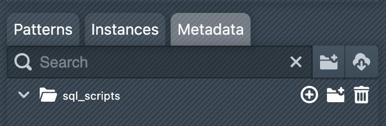 To access a project's meta database, switch to the Metadata tab in the sidebar. The sidebar is initially empty for a new project. You must first create a folder in order to create objects such as tables, views and scripts in it. To do this, click on the New Folder icon (