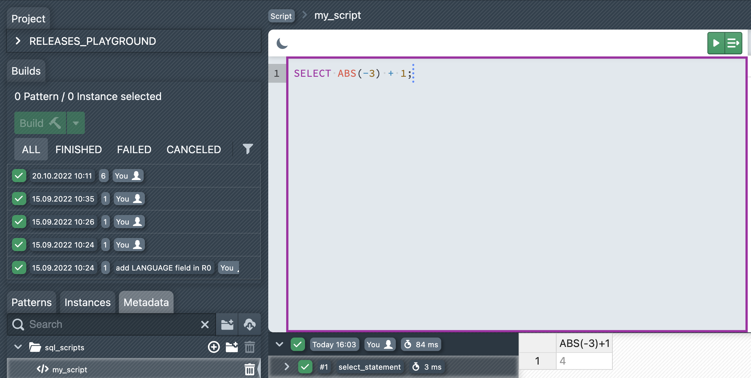 SELECT ABS(-3) + 1;You can now execute statements using the Execute SQL Statement button (