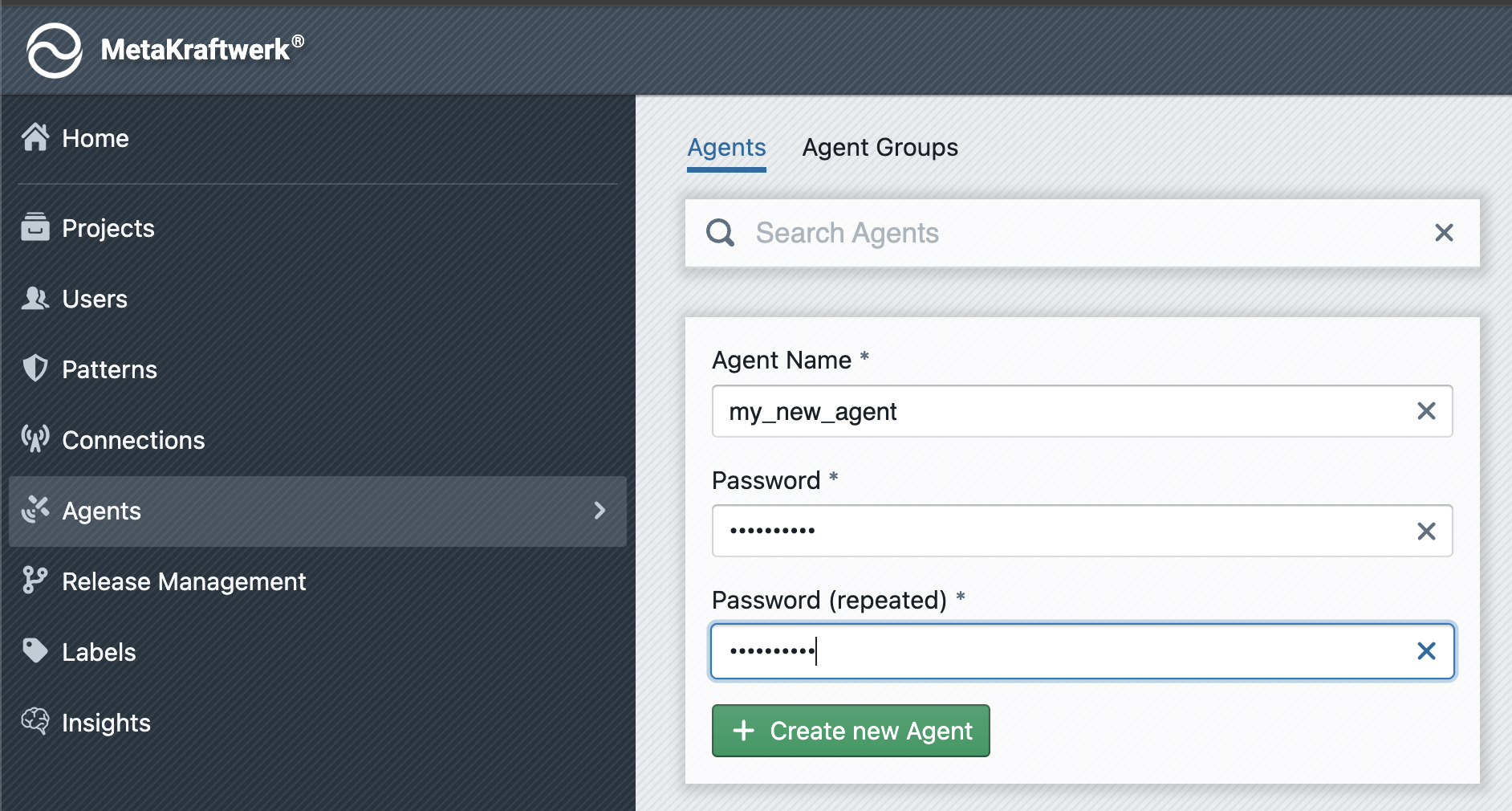 - Once the agent is online, select it in the MetaKraftwerk web interface (top right menu).