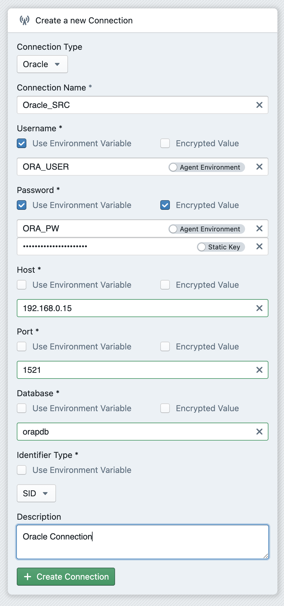 To use a variable for a connection property, activate the Use Environment Variable checkbox for a property. You can now enter the name of the environment variable in the text field. There are two types of variables: Agent Environment and User Variable. You can switch between these two using the switch on the right-hand side of the text field. With Agent Environment, the variables are searched for on the system on which your agent is running, i.e. environment variables that you have set in the operating system. With User Variable, the variables that you have set in the profile are accessed.