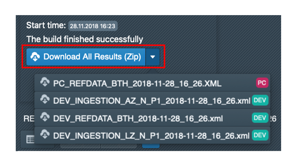 Selecting a build in the sidebar displays the build in the main window. After completion of the build, the generated XML/ZIP files are displayed, which can be downloaded. These files can then be imported into an Informatica repository.