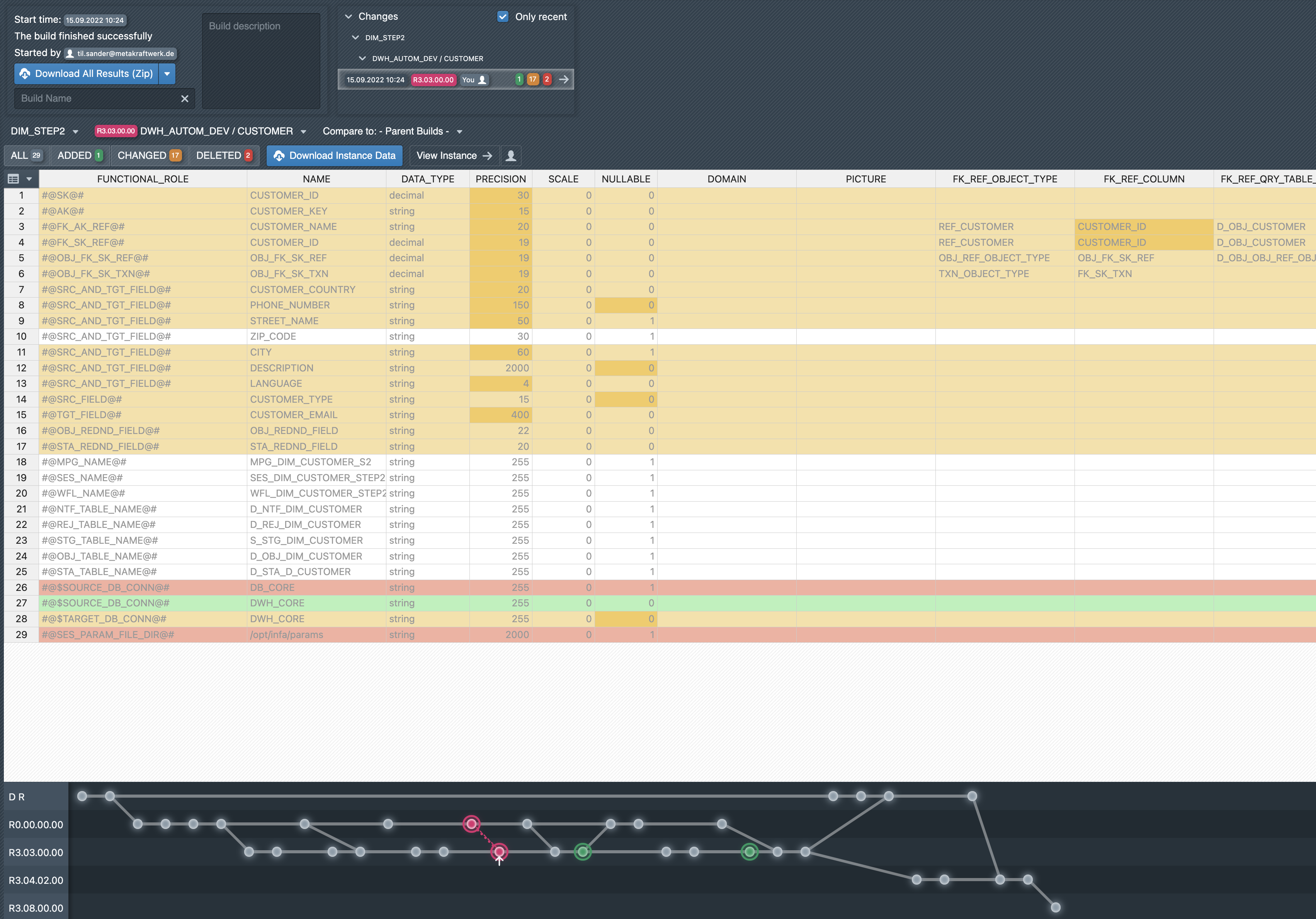 MetaKraftwerk creates a commit with each build of an instance. The status of the instance is thus recorded so that the user can see afterwards what metadata the instance had at the time of the build. When you open a build, a diff table is displayed in the lower area. For a selected instance, it shows which metadata records have been newly added (green), changed (orange) or deleted (red), and which records have remained unchanged (grey). A drop-down menu above the table allows you to select other instances that were built together. Another drop-down menu can be used to select other patterns, provided that instances of other patterns were also built with the current build. When you select an instance, it is first compared with the last build with which the selected instance was built ('Compare to: - Parent Builds -'). However, a third drop-down menu can also be used to select a different, earlier comparison build.