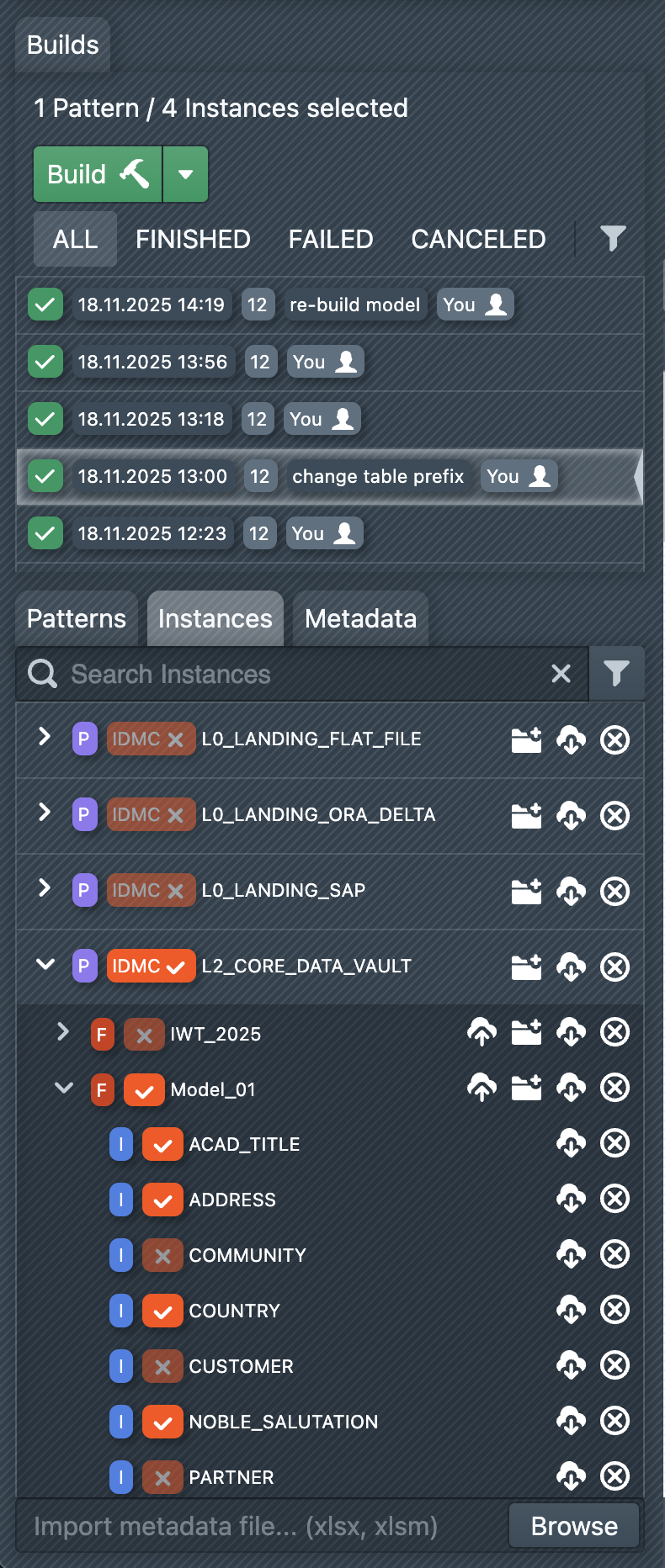 To start a build, you first have to select the instances you want to create. An instance can be added to the selection by selecting the checkbox on the right side of the instance entry. It is possible to select instances of different patterns. A build can then be started via "Build". As a result, MetaKraftwerk generates import packages and files for the selected patterns and instances, which you can download or deploy once the build is complete.