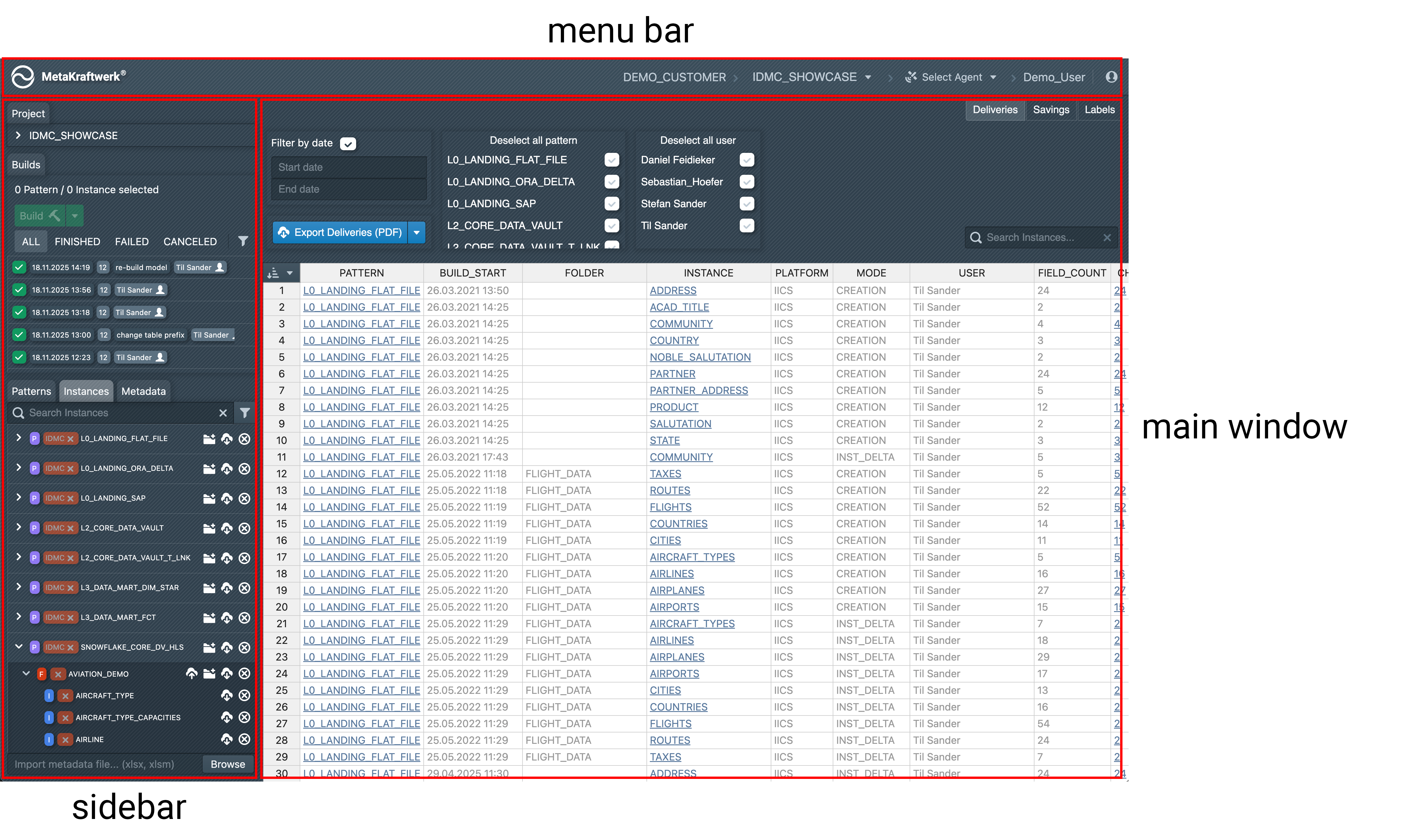 The sidebar, which allows you to switch between different subsections of the application: the project summary, the previous builds, the existing patterns and instances, and the Meta Database.