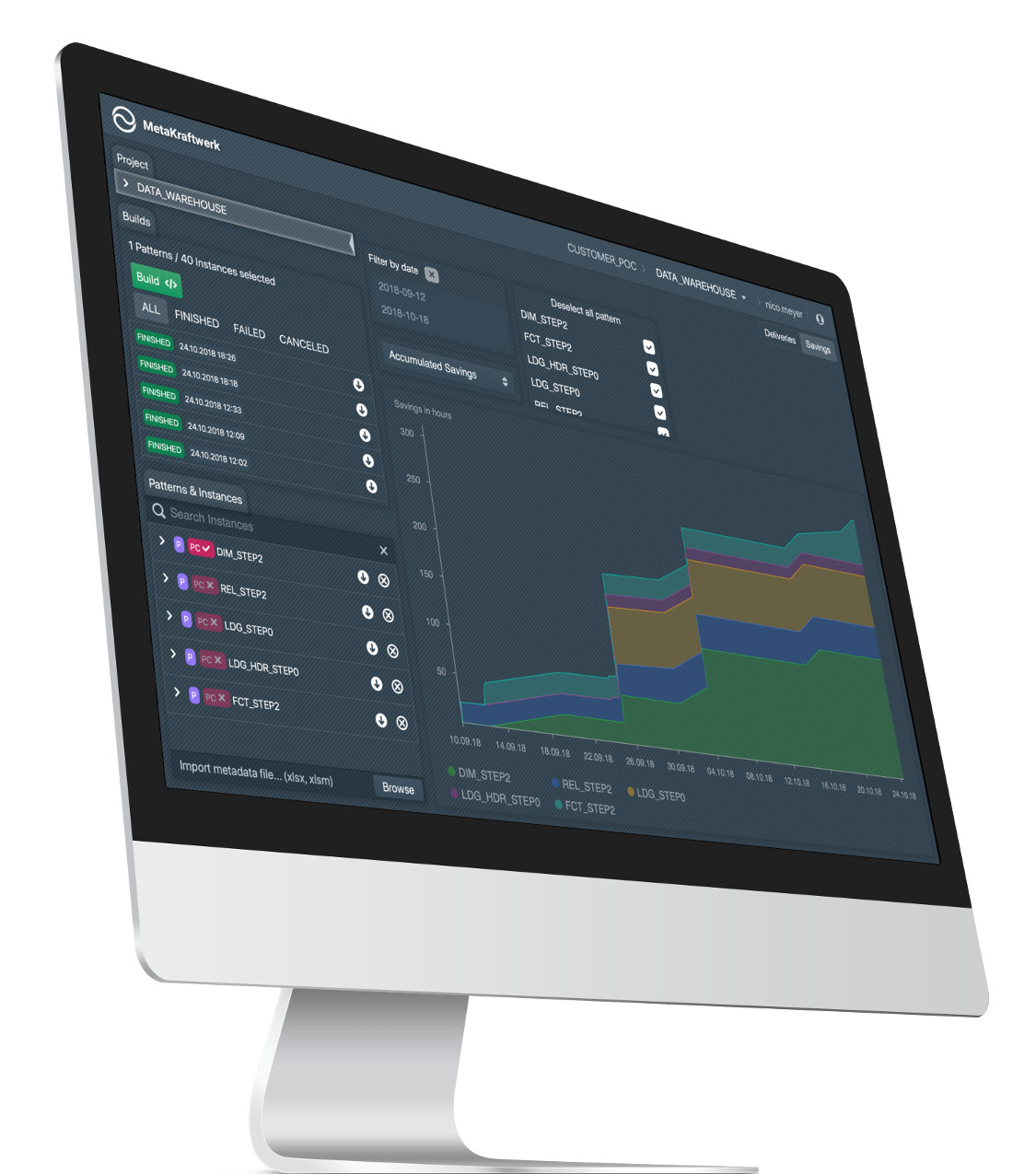 MetaKraftwerk automates the development in data integration - be it within the framework of a data warehouse, a data hub or a data lake or a combination thereof: MetaKraftwerk automates all automatable development tasks.