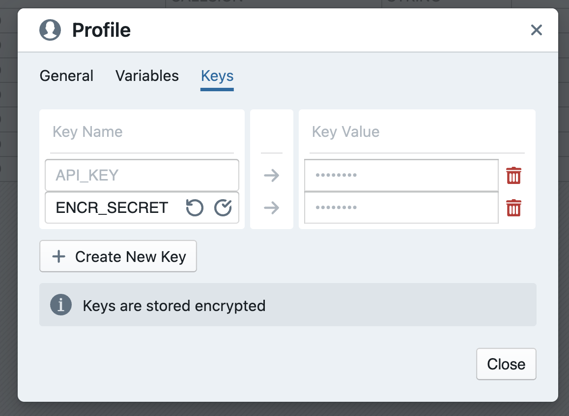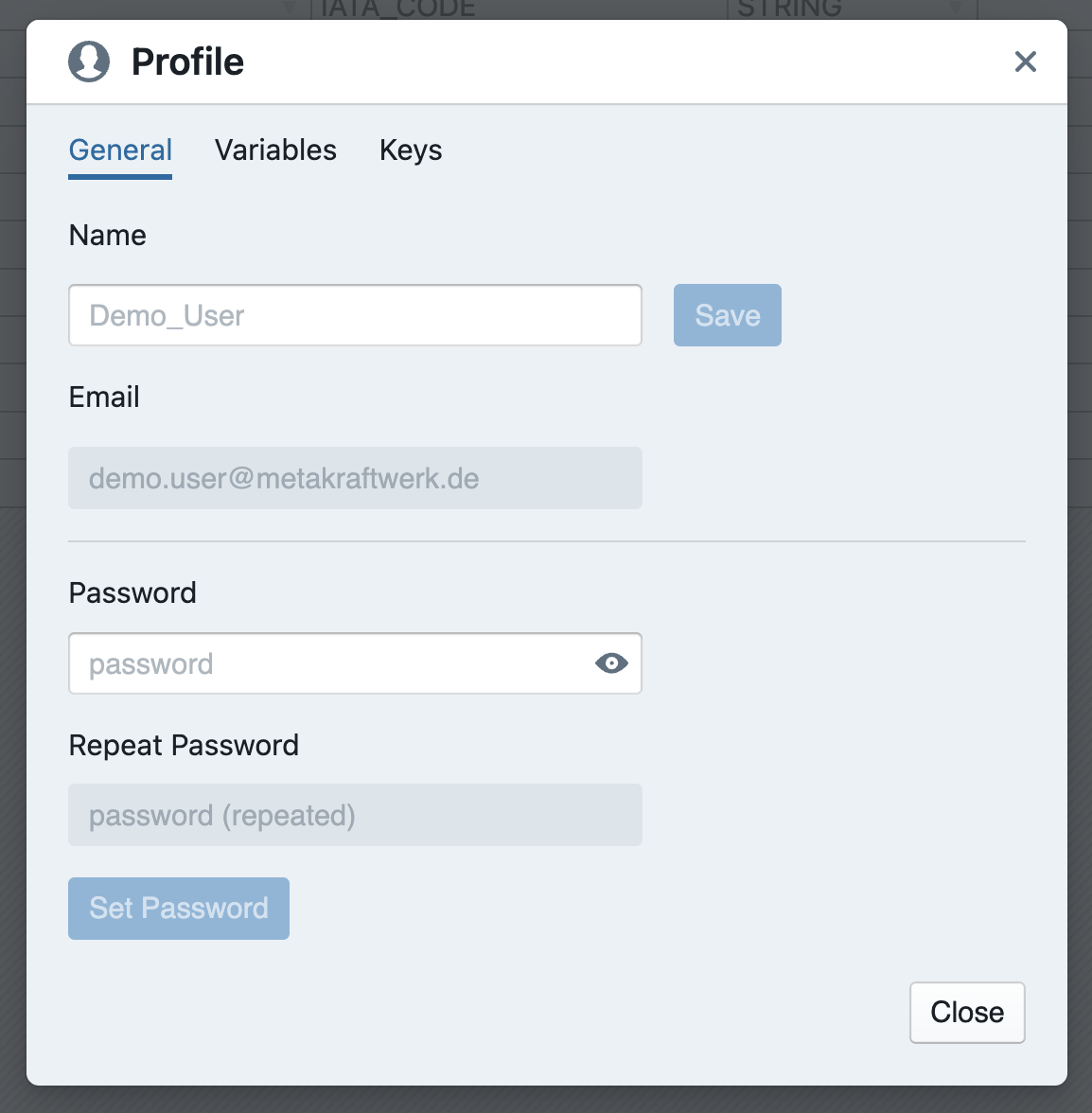 User keys work similarly to user variables. However, secret values are stored here. The values are stored encrypted by MetaKraftwerk. In addition, it is no longer possible to view the value after it has been set.