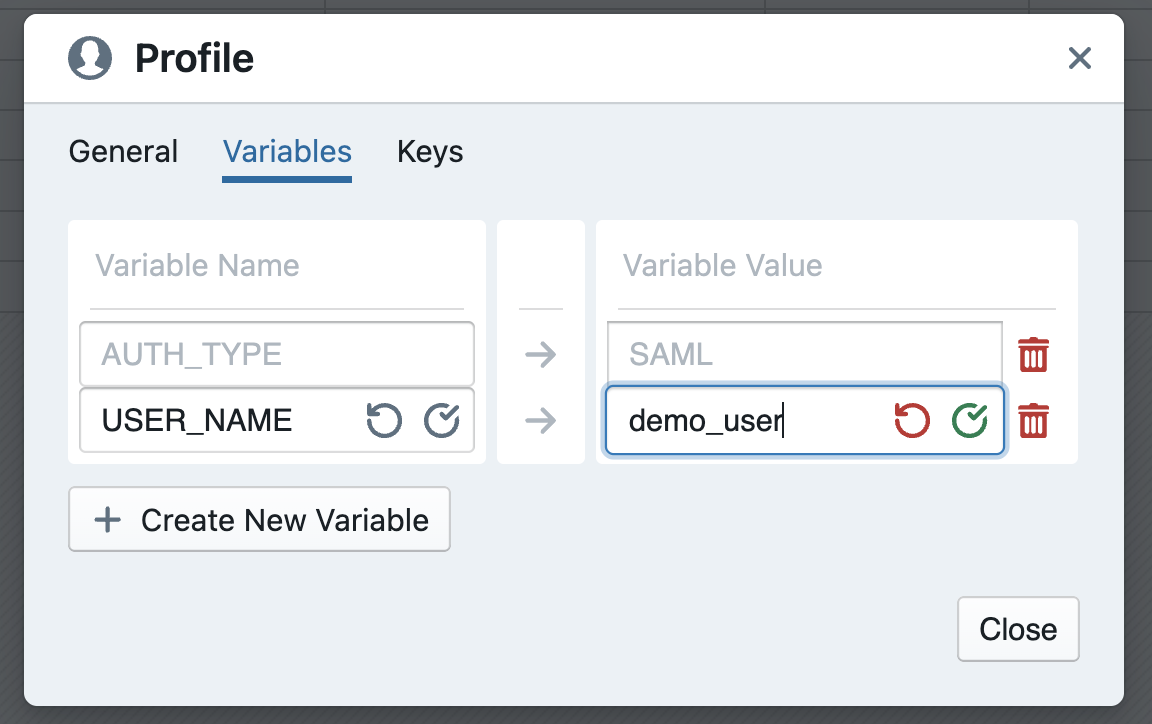 User variables and user keys can be defined in the user profile. Switch to the Variables tab. Click on + Create New Variable. A new variable will now appear in the list. Enter the name of the new variable in the text field on the right and confirm by clicking on Confirm (