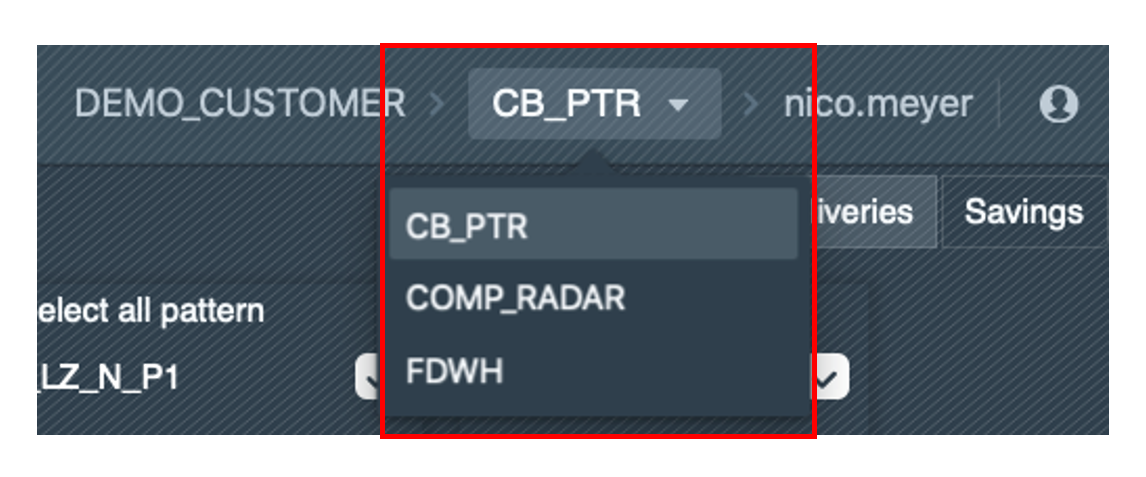 A dropdown in the menu bar can be used to switch between the various projects to which a user is assigned. It is possible for a client to create several projects into which different patterns are grouped.