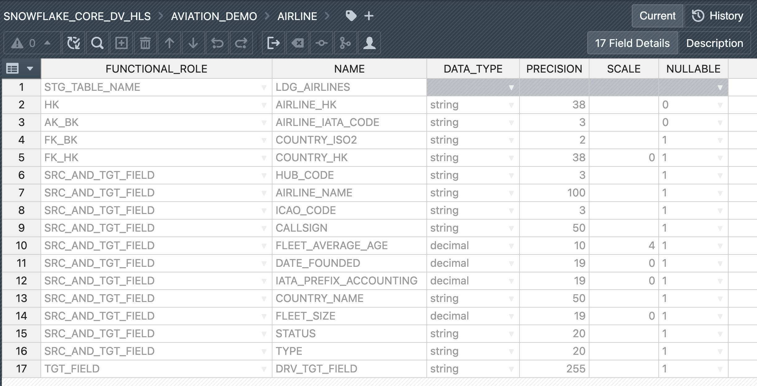 Metadata is stored in MetaKraftwerk in relational form, i.e. it is made visible to the developer in the form of a table. Instances thus consist of rows of metadata records and columns with the properties of an instance. For each row, it is specified what functional role it plays in the build of the instance, i.e. whether it is, for example, a key in a table or a parameter for the process.