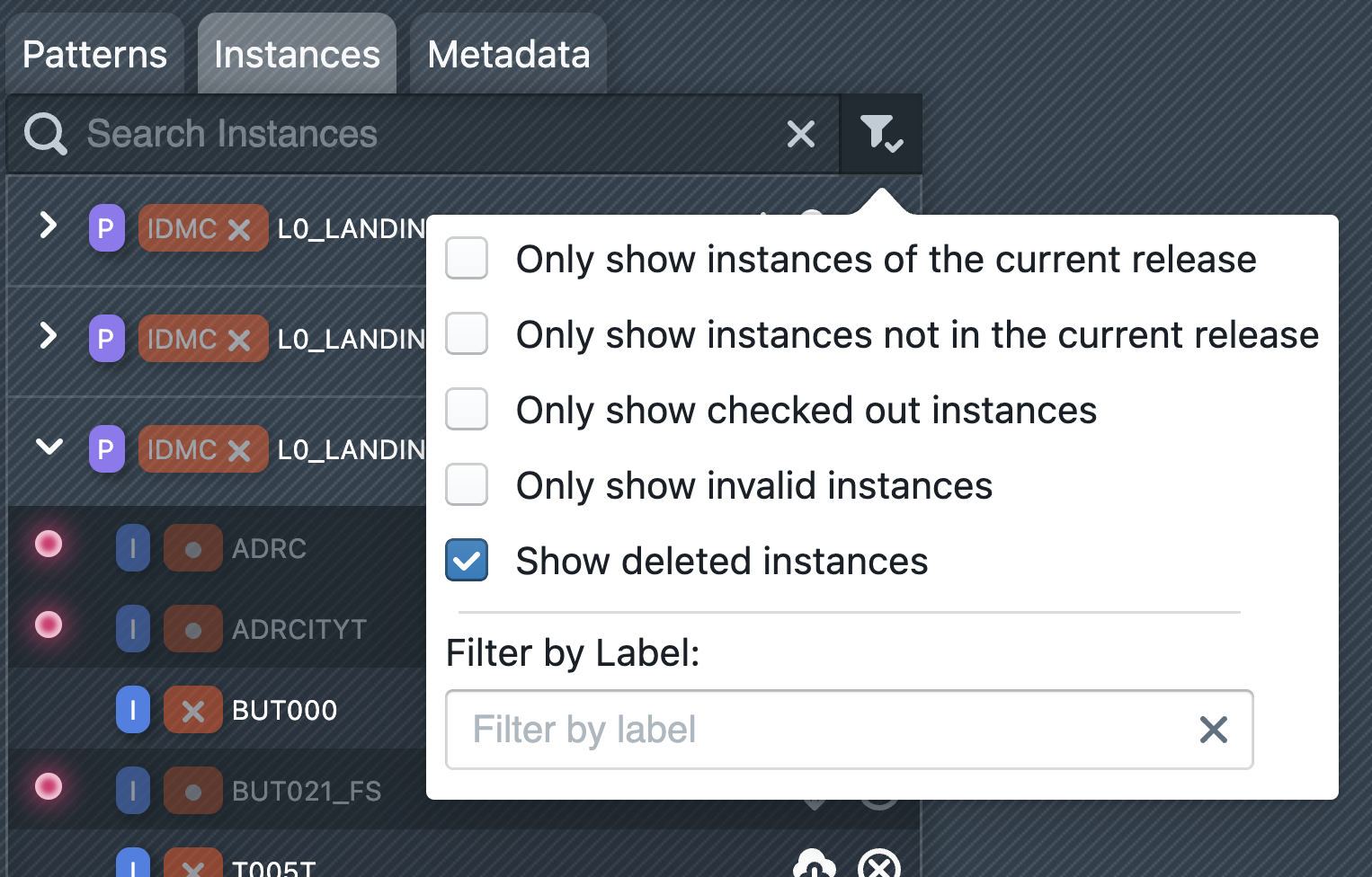 If there are already commits for an instance, the instance will only be soft-deleted, i.e. it will be marked as deleted and will no longer appear in the sidebar. You can then view deleted instances by opening the instance filter (to the right of the search bar) and selecting 'Show deleted instances'. Deleted instances are then displayed with a red dot in the sidebar.