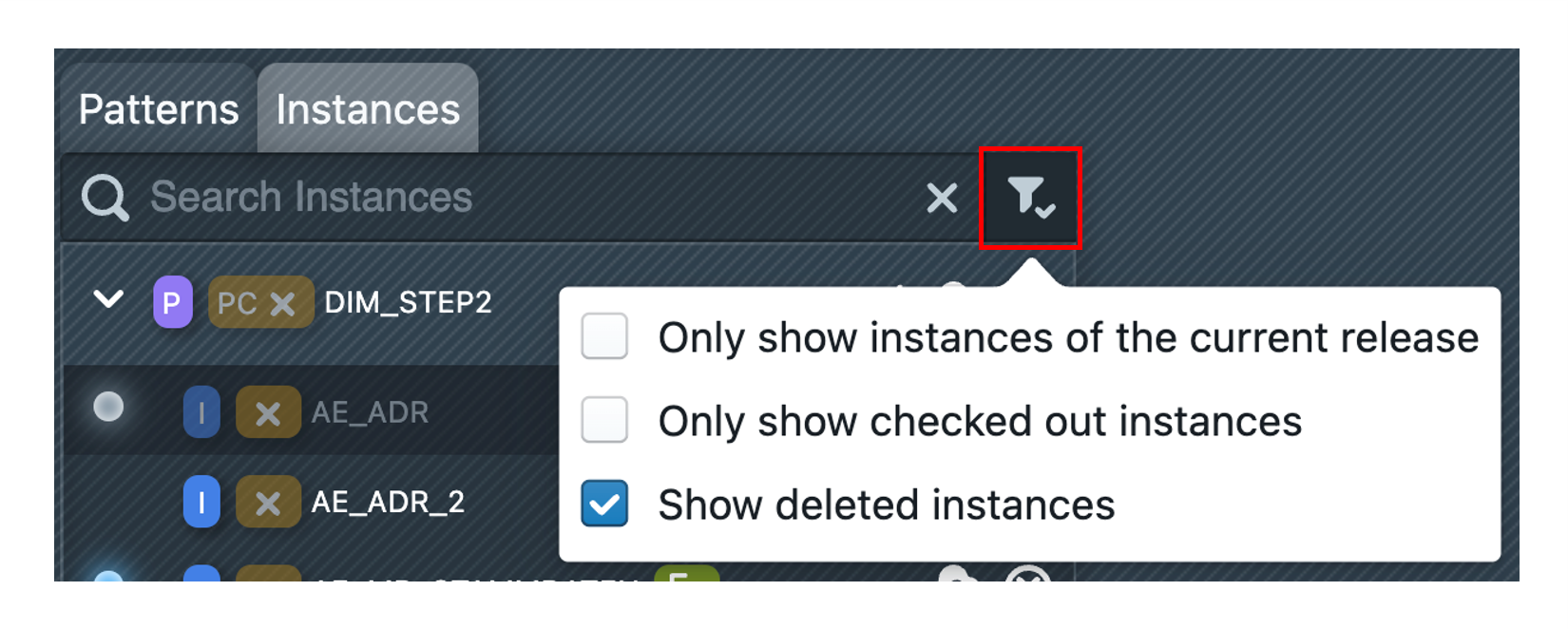 After confirmation, the instance is logically deleted, i.e. it can no longer be viewed and is no longer listed in the normal view. However, the history of the instance is still saved, so you can easily restore the instance. To do this, select the "Show deleted instances" option in the instance filter, then find the instance and open it. Deleted instances are marked with a red dot on the left side