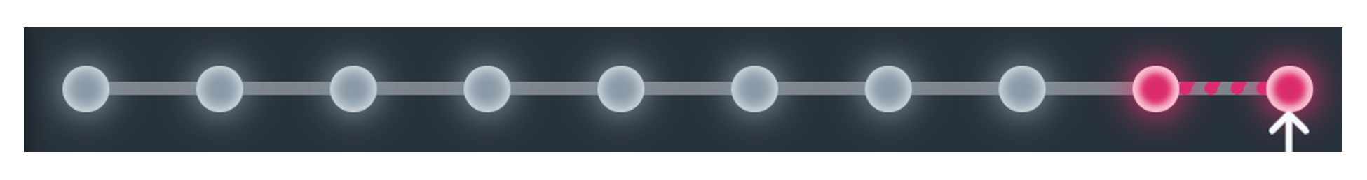 First, it is useful to understand how an instance is versioned if no release management is configured for the associated pattern. In this case, there is only a linear history of the instance metadata for an instance; a commit is created for an instance with each build or explicitly at the push of a button. For this commit, all fields of the instance are stored at the commit time, so that it is always possible to view the state of the instance at a selected commit in retrospect. The commits are chronologically one after the other, there is no concurrent development of the instance as shown in the diagram below (one point per commit).