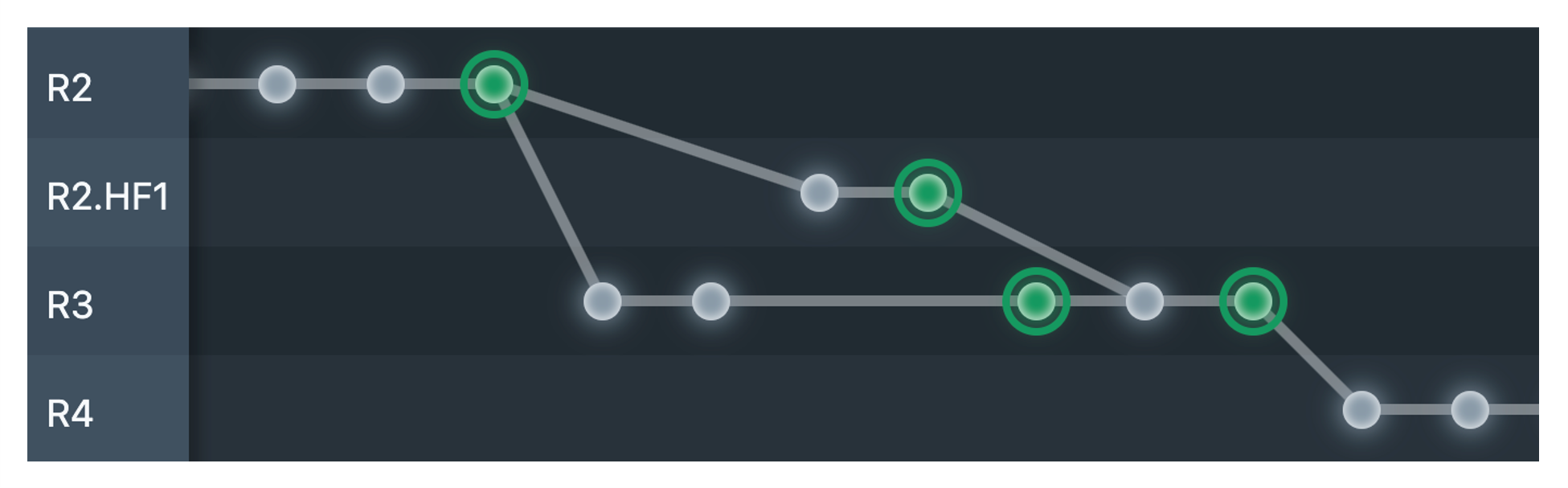 You can see that the instance had first commits in Release R2, then continued development in Release R3, based on the last state in R2. However, there was then a necessary hotfix in Release R2.HF1. This adjustment was then merged back into Release R3, so the fix applies here as well. Somewhat later, a change was made to Release R4.