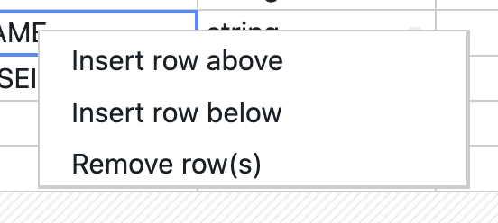 Right-clicking on the table opens the context menu for the table. Here you can insert new rows above or below the current selection or delete the current row.