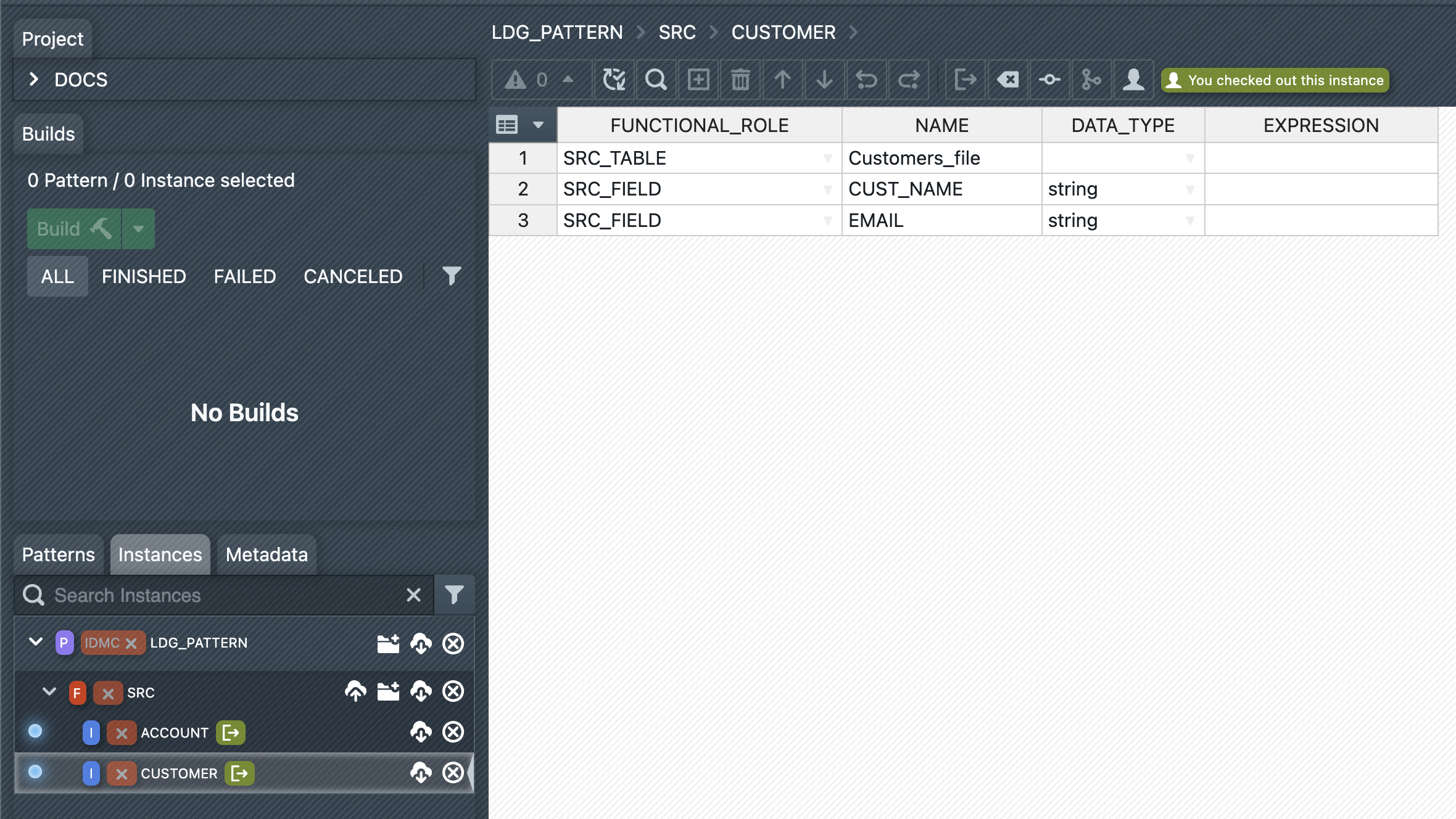 For the following examples, let us assume that we already have an instance named "ACCOUNT" in a folder named "/SRC". The corresponding pattern is called "LDG_PATTERN". The following shows the instance metadata for the instance so far: