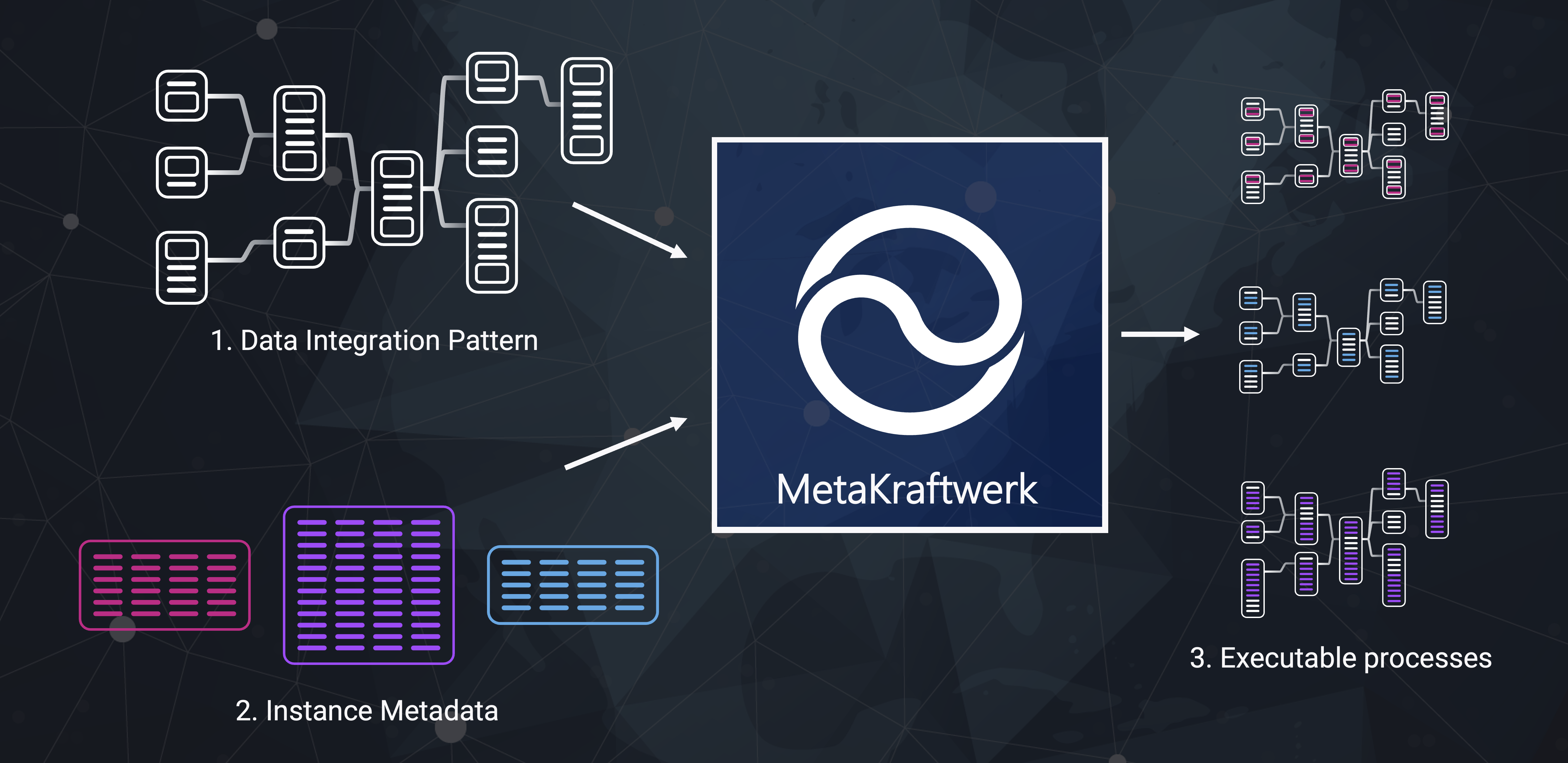 The metadata is then exported and imported into MetaKraftwerk. A process pattern is not executable, but contains placeholders in data structures and configuration properties, which are filled via instance metadata. From the process pattern and one instance MetaKraftwerk creates an executable process instance, as shown in the diagram. The directly deployable processes can then be imported into the target platform.