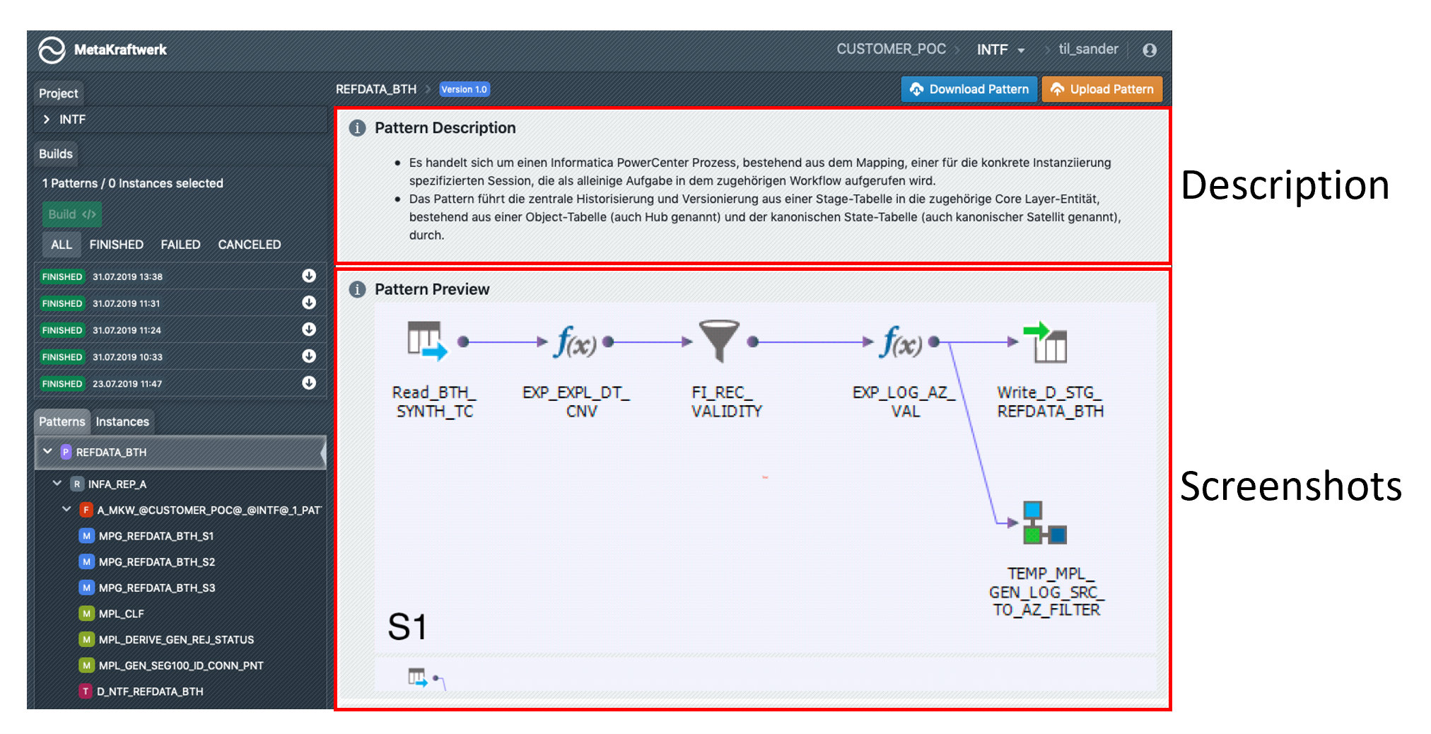 If you select a pattern in the sidebar, the documentation of the pattern will be displayed. Here the developer sees a description of the pattern and screenshots of the mappings and workflows contained. If you have the permissions to edit a pattern, you can click on the pencil icon next to "Pattern Description" and edit the description.