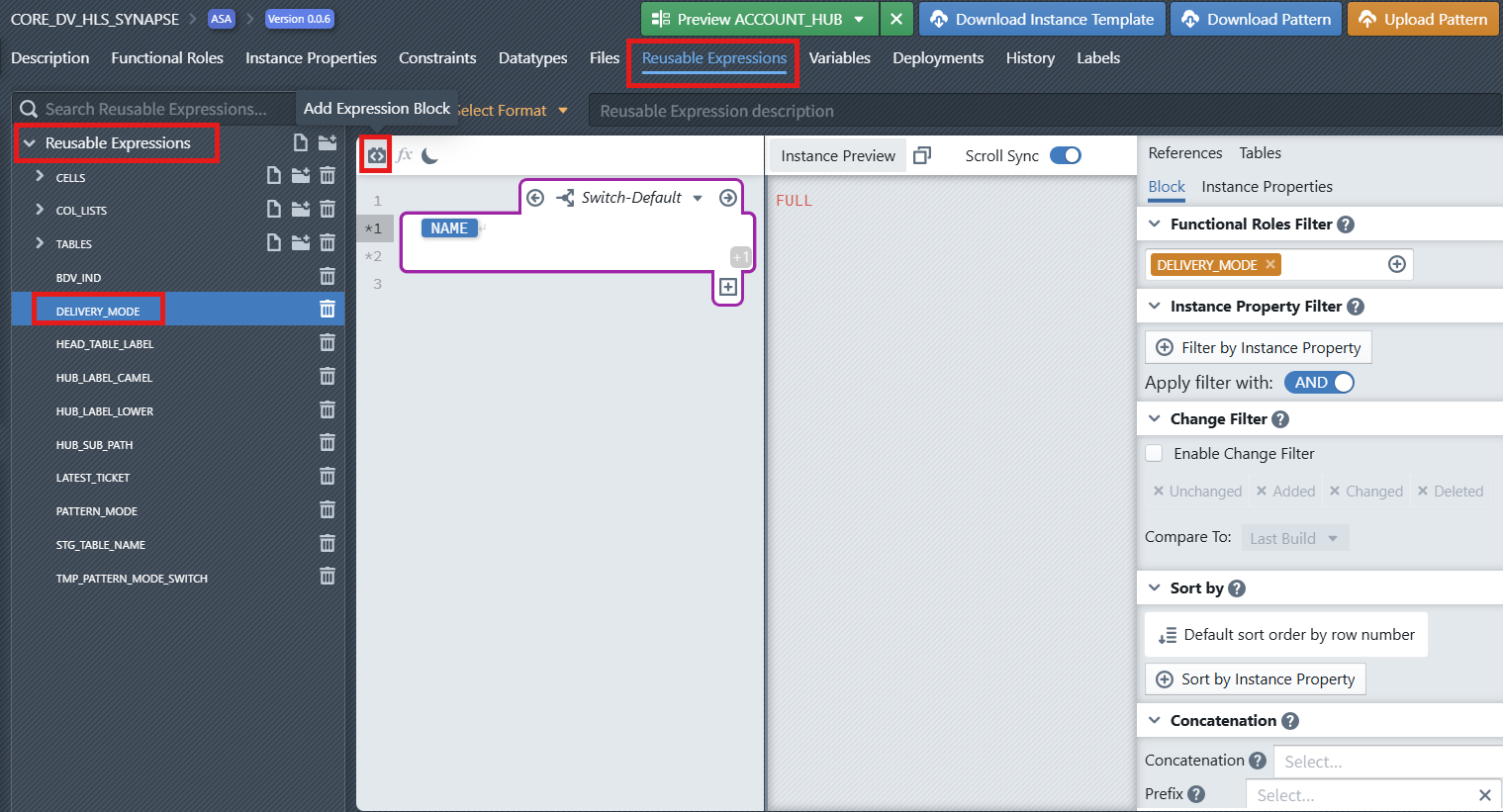 Reusable expressions are developed using the same metadata editor framework as file templates and other pattern elements. This provides access to: