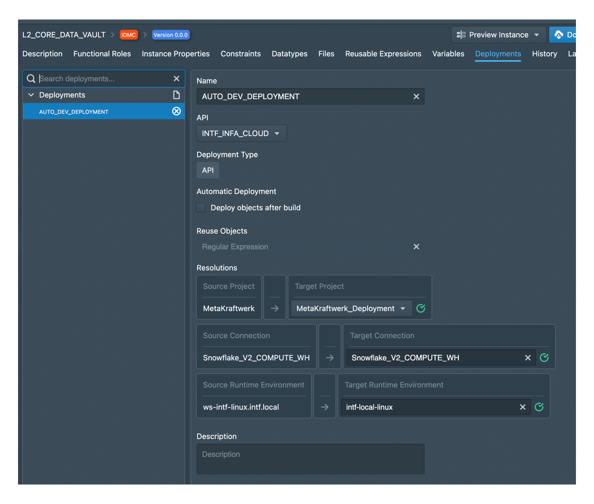 To deploy build results, you can define deployments in the pattern configuration. The definition specifies which created files are deployed to which target environment. For this purpose you have to select an API / Connection which will be used for the deployment. In addition, depending on the connection type, further settings must be made, e.g. what should happen with already existing objects (retain/overwrite). In addition, a deployment can be set as automatic, so that it is automatically executed after a build for the build results.