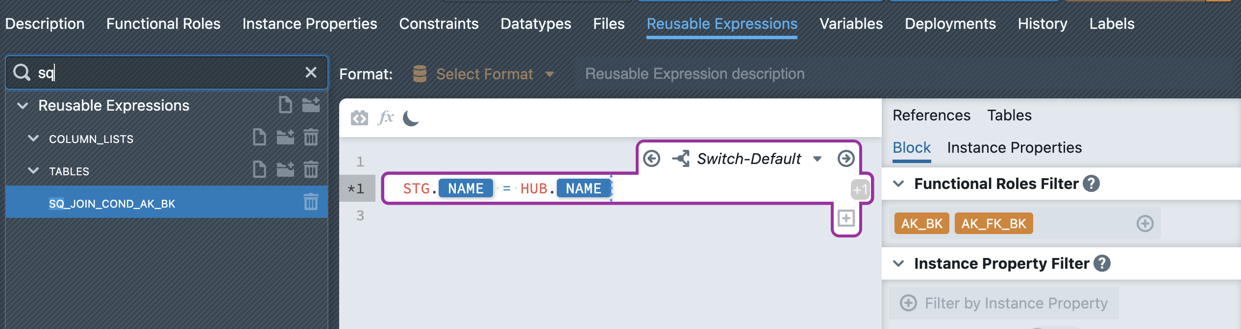 When developing a pattern, it often happens that some expressions are used more than once in different parts of the pattern. To avoid repeating the metadata expression each time, so-called reusable expressions can be created. These are developed similar to a file template with the metadata editor. The reusable expressions can then themselves be used in other places of the pattern in the metadata editor (visible by purple placeholder).