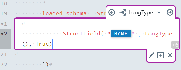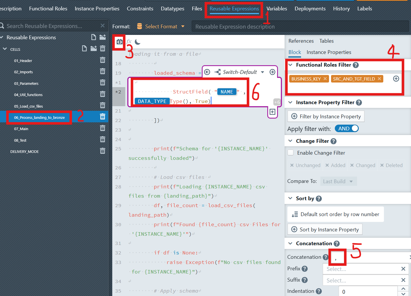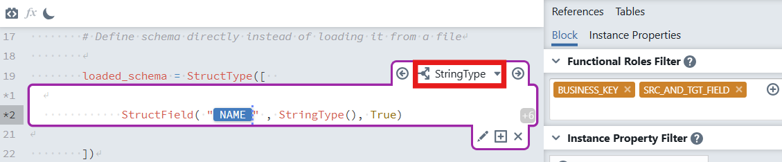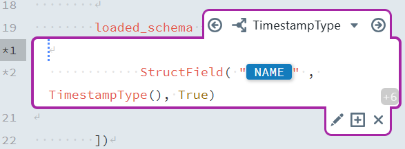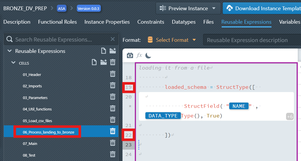 06_Process_landing_to_bronze, and findloaded_schemain the function process_landing_to_bronze().Position the cursor where you want to add the schema definition, click the Add Expression Block icon