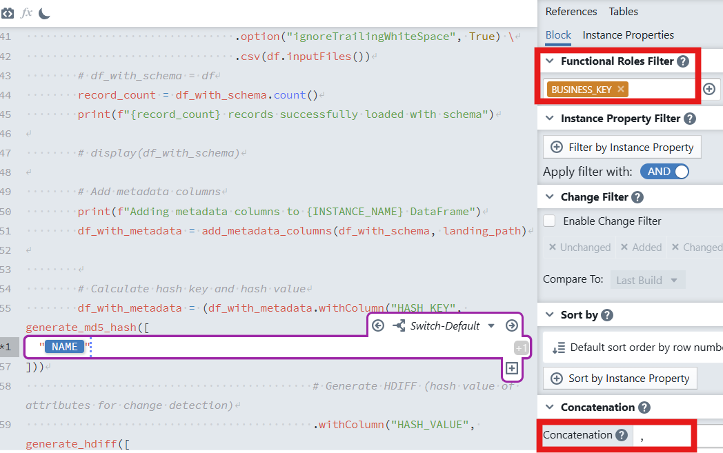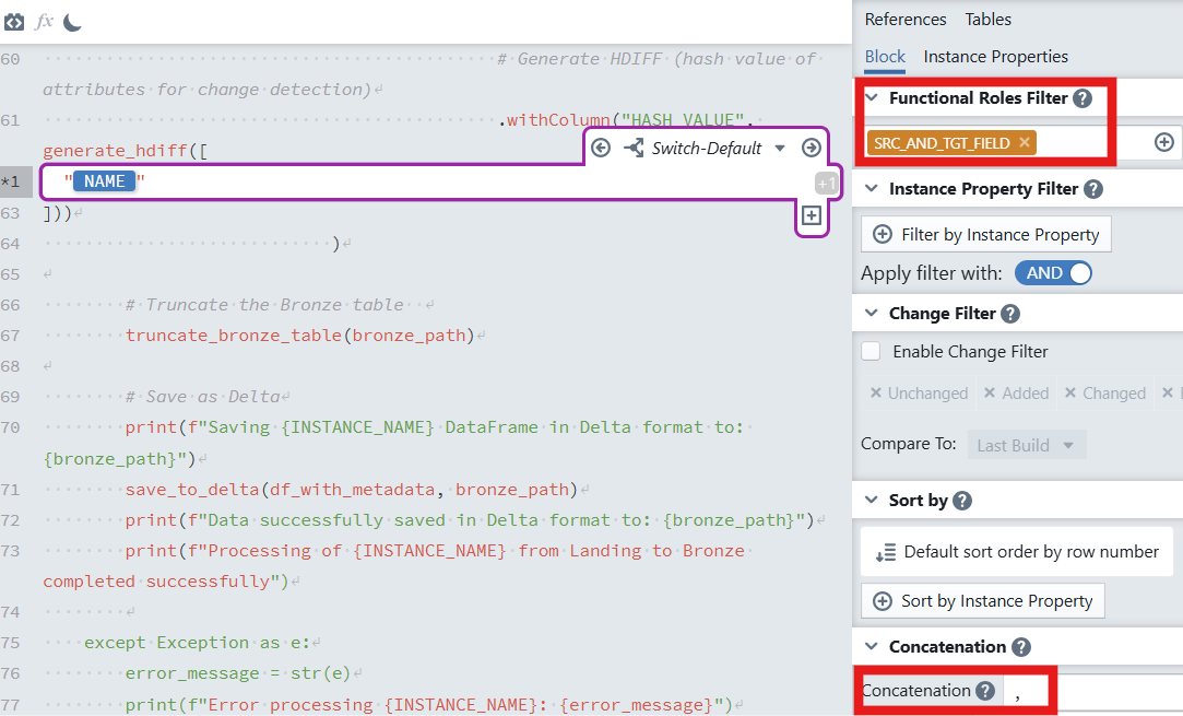 Functional Roles Filter: Select the functional roleBUSINESS_KEYandSRC_AND_TGT_FIELD. Concatenation: Use,(comma) as the separator.Switch-Default: Inside the block, In the content field, enter: