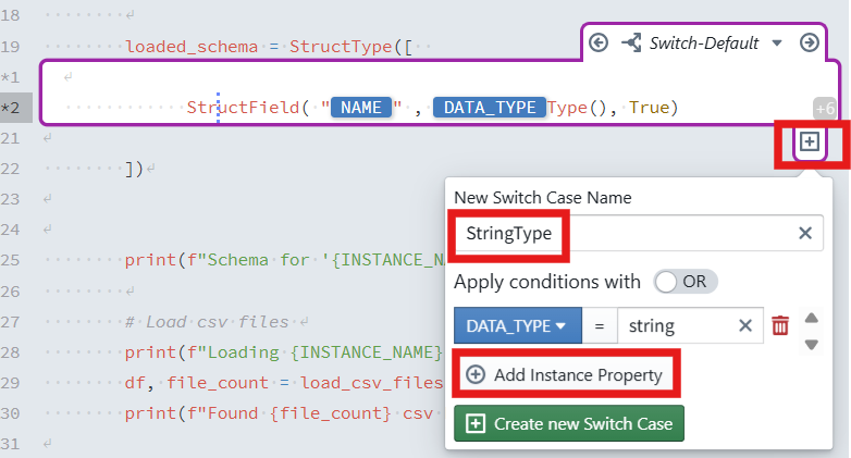 + Add Instance Propertyand then selectDATA_TYPEfrom the dropdown, enterstringin the input.Click the + Create new Switch Case button. The case then appears in the editor.