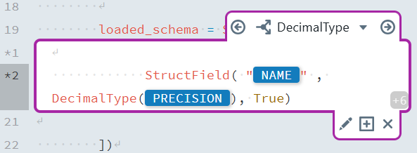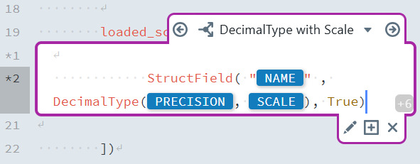 DecimalType | DATA_TYPE = decimal | StructField("[NAME]", DecimalType([PRECISION]), True) |
