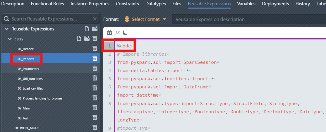 %markdownheader, see the page Part 7 (optional) - Add a dynamic markdown header.02_Importsuses%code. It contains import statements for PySpark, Delta, and types. Being a%codecell, it is executed and makes these symbols available to subsequent cells.03_Parametersuses%parameters. It defines configuration variables. These variables are injected by the pipeline/notebook and referenced later in%codecells.WARNING
