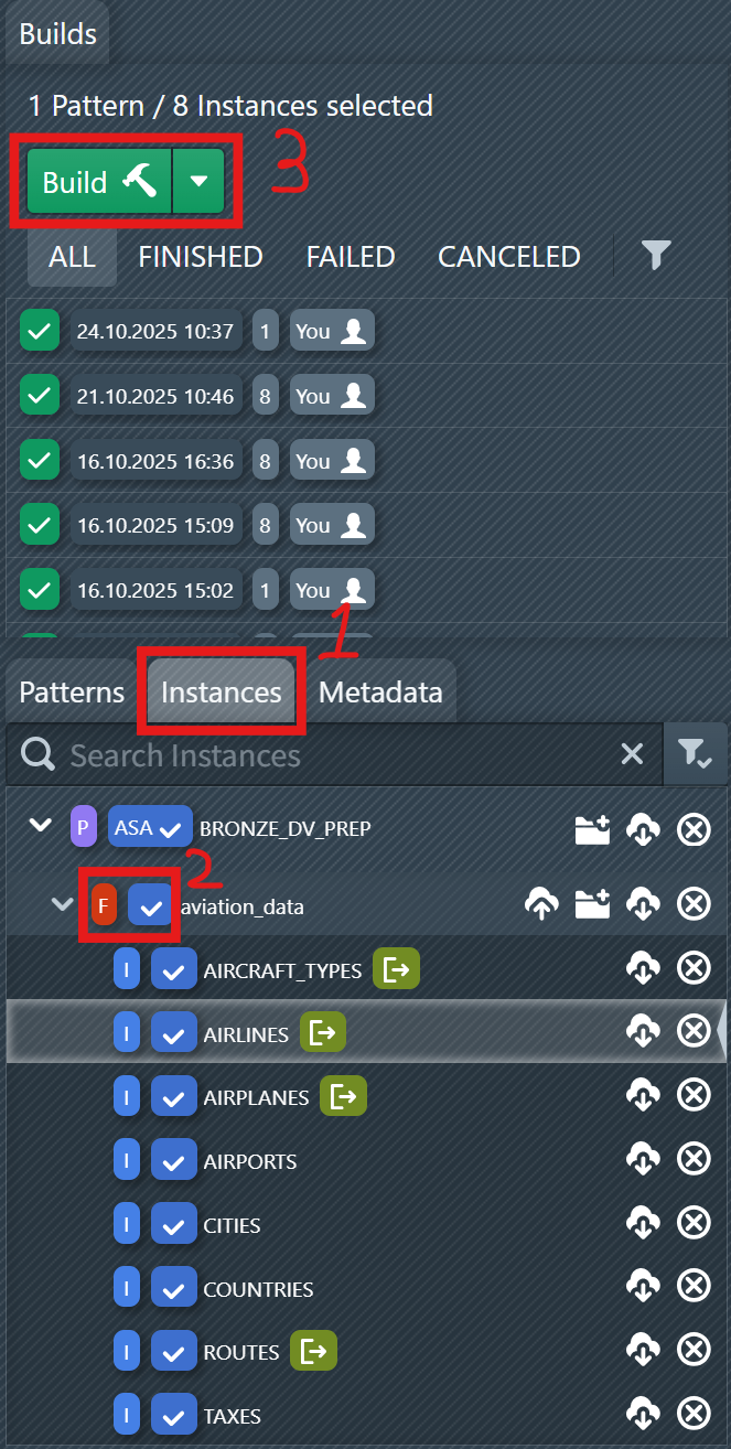 Instancestab in the Builds page (marked as 1 in the first screenshot above). This shows the buildable instances grouped by pattern and folders. - Expand your pattern and select the folder or individual instances by ticking the checkboxes on the right (marked as 2). You can mix instances from different patterns if required.