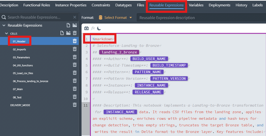A dynamic markdown header turns your notebook’s first cell into living documentation. It shows who built the artifact, when it was generated, which pattern and instance were used, and the release. This creates immediate context for reviewers and operators and prevents “which version is this?” confusion.