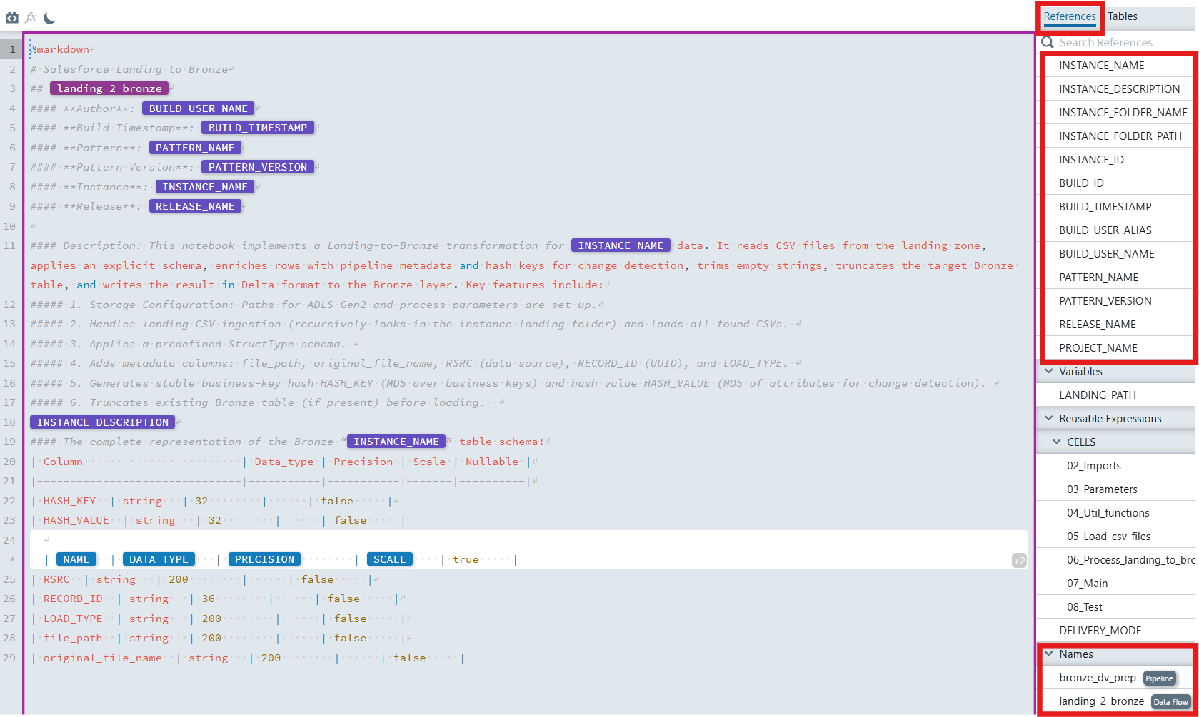 <...>shoud be replaced by references in MetaKraftwerk.txt# Salesforce Landing to Bronze ## <landing_2_bronze> #### **Author**: <BUILD_USER_NAME> #### **Build Timestamp**: <BUILD_TIMESTAMP> #### **Pattern**: <PATTERN_NAME> #### **Pattern Version**: <PATTERN_VERSION> #### **Instance**: <INSTANCE_NAME> #### **Release**: <RELEASE_NAME> #### Description: This notebook implements a Salesforce Landing-to-Bronze transformation for <INSTANCE_NAME> data. It reads CSV files from the landing zone, applies an explicit schema, enriches rows with pipeline metadata and hash keys for change detection, truncates the target Bronze table, and writes the result in Delta format to the Bronze layer. Key features include: ##### 1. Storage Configuration: Paths for ADLS Gen2 and process parameters are set up. ##### 2. Handles landing CSV ingestion (recursively looks in the instance landing folder) and loads all found CSVs. ##### 3. Applies a predefined StructType schema. ##### 4. Adds metadata columns: file_path, original_file_name, RSRC (data source), RECORD_ID (UUID), and LOAD_TYPE. ##### 5. Generates stable business-key hash HASH_KEY (MD5 over business keys) and hash value HASH_VALUE (MD5 of attributes for change detection). ##### 6. Truncates existing Bronze table (if present) before loading. <INSTANCE_DESCRIPTION> #### The complete representation of the Bronze <INSTANCE_NAME> table schema: | Column | Data_type | Precision | Scale | Nullable | |-------------------------------|-----------|-----------|-------|----------| | HASH_KEY | string | 32 | | false | | HASH_VALUE | string | 32 | | false | <add_expression_block_here> | RSRC | string | 200 | | false | | RECORD_ID | string | 36 | | false | | LOAD_TYPE | string | 200 | | false | | file_path | string | 200 | | false | | original_file_name | string | 200 | | false | <or_add_expression_block_here>Add a short description and a compact schema summary for fast reading. Add technical columns, such as HASH_KEY, HASH_VALUE, etc., must be statically entered before the expression block so that the entire schema can adapt. Then insert an expression block to display the schema information for all the columns.