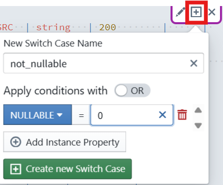 + Add Instance Propertyand then selectNULLABLEfrom the dropdown, enter0in the input. - Click the + Create new Switch Case button. The case then appears in the editor.